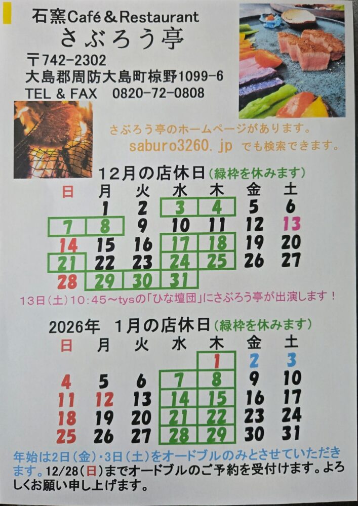 12月・1月の店休日を更新しました